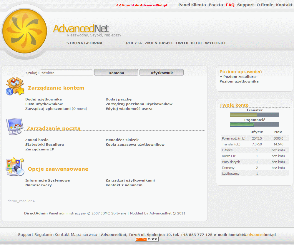 Panel użytkownika to najważniejszy element całego systemu. Pozwala dodawać i usuwać domeny, tworzyć w ich ramach konta e-mail, subdomeny, bazy danych, aliasy i wiele innych - dostępnych dla użytkownika końcowego.