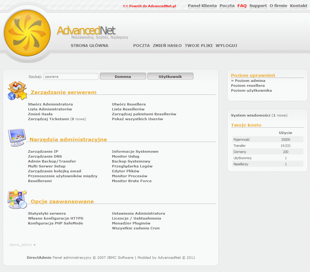 Panel administracyjny DirectAdmin to znakomite narzędzie do rozpoczęcia świadczenia usług hostingowych. Szereg narzędzi administracyjnych pozwala na zarządzanie usługami takimi jak serwer www, serwer ftp, serwer poczty czy serwery baz danych. Poza tym posiada funkcje umożliwiające tworzenie pakietów hostingowych z dowolnymi parametrami, tworzenie użytkowników i przypisywanie im utworzonych pakietów.